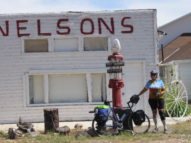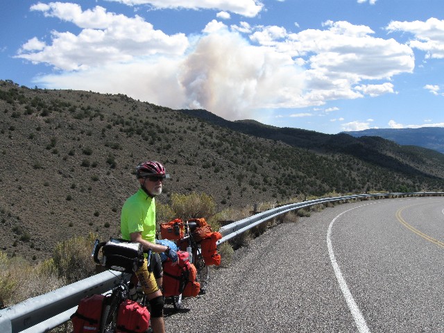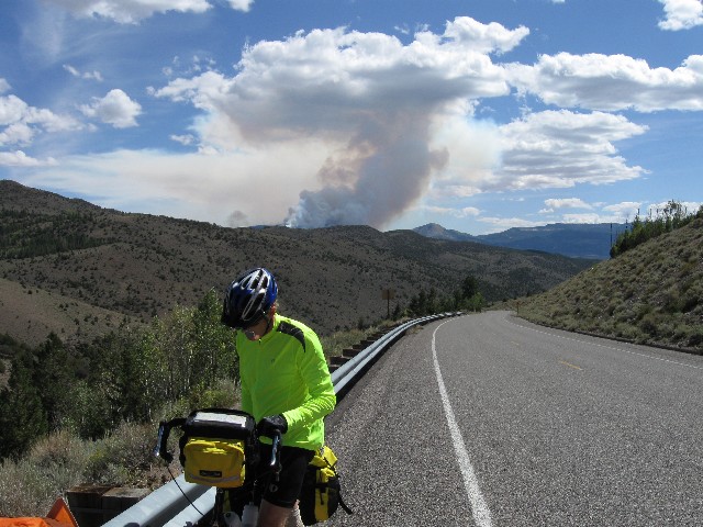 Starting out in the wind from Torrey, I pause for a scenic toilet photo. There is lots of wind to Bicknell, then warming and a bit more calm. Those of us starting at Torrey meet the rest of the group in front of the tiny liquor store in Bicknell. Out of Fremont, the hills begin and continue, continuing on. Aspens aglow on a side hill contrasts with the inky black of smoke from a blow-up of the forest fire to the East.