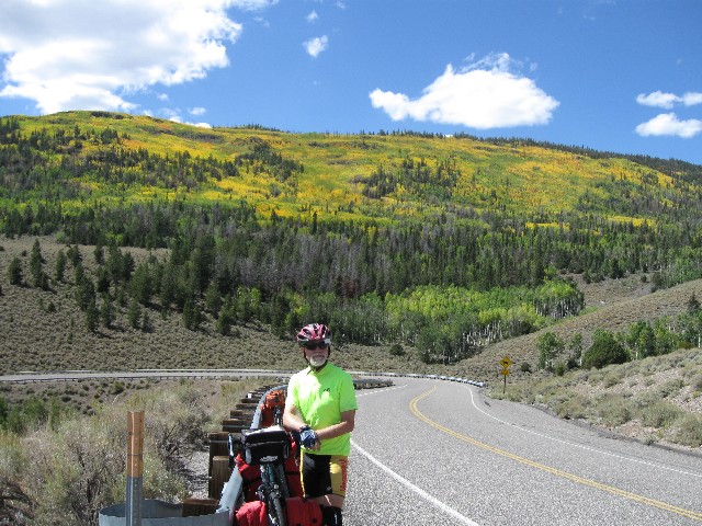 The Aspen leaf flutters past as I waver, nearly flopping onto the tarmac. Too slow for the cyclo computer to register. Argh. Pains shooting from the left knee remind me I probably need (another) regearing of the trusty VM (Venerable Monster, the Specialized Expedition long-distance touring bicycle). Somewhere, is the top of this climb toward Fish Lake.