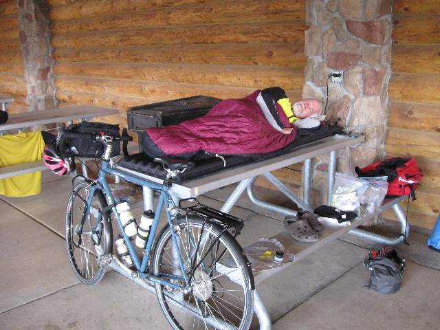 Rob P. and I outran most of the storm, followed by a deadly calm feeling. Booming of the electrical grid punctuated this calm. After we deposited bike et al., in the pavilion, it rained while we walked across the way and enjoyed a chicken sandwich followed by more showers and an alfredo spaghetti dinner. Again, we are graced by the low bellow of a winnehogo generator this evening.