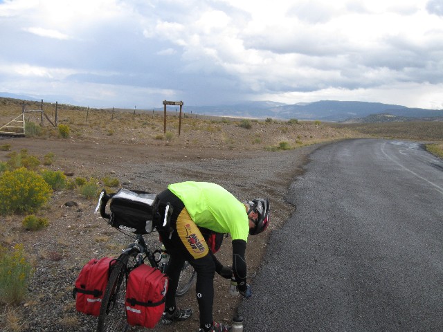 The wind ripples through the saturated yellow fluff heads of Rabbitbrush, which blooms in the Fall across the high desert. Then, shards of nearly-horizontal rain spackle across the road, stinging my legs. Yikes, what else can be added to this easy day gone hard? At least the First Law of Bicycling holds - the wind is always in your face. Law Two has not held today - What goes down must go up (a unidirectional law). Plowing Grass Valley has proven to be more than a lilt.
