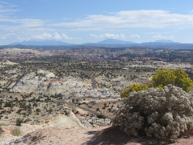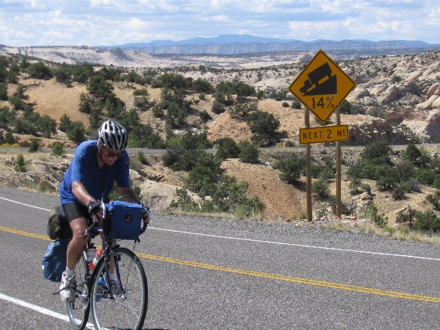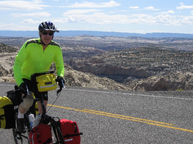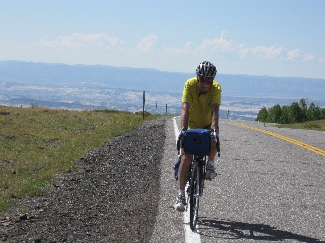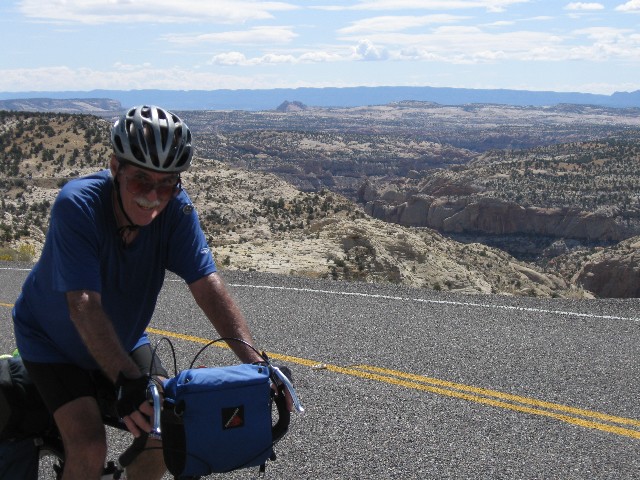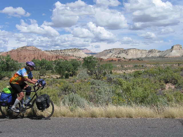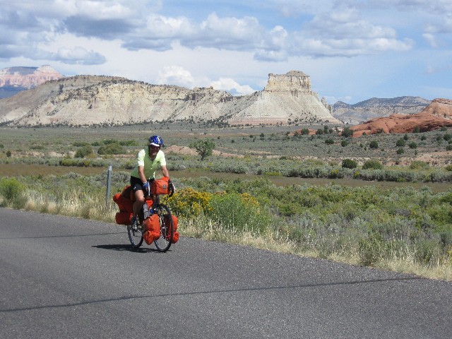 Grinding slowly, I'm once again thinking about re-gearing the VM (Venerable Monster, the Specialized Expedition long-distance touring bicycle) on this 15-mile ascent to the 9600' summit - actually the shoulder of Boulder Mountain, between MP (mile post) 100 and 101. An ebony cloud is growling and spitting above Boulder Mountain. Elsewhere, the sky is a robin egg blue. Up and up more. Thirty five hundred feet of climbing with nary a respite. When the down comes, it is transient, then the road heads up again. It rolls down, settling out a few miles outside of Torrey. To the East are gorgeous vistas toward the Henry Mountains, rising from the sea of redrock. The Wingate of the land of Capitol Reef prominently appears, and Rob P. and I ease to where we part for the route home.