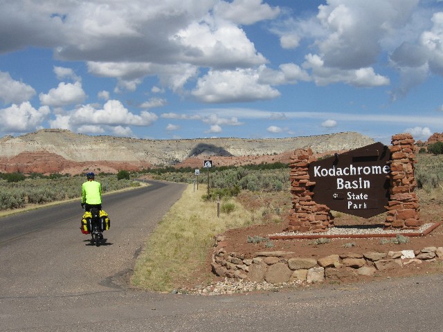 Lugging nearly to a stop, I inch up the worming high-angle road from the Paria into the Escalante drainage. After a pleasant roll from Kodachrome SP to Cannonville, where I get apples and plums from the trees near the city building, and followed by a pause at the store for a few snacks, we turn onto Hwy 12 and into the wind. Wind from the East - where is the prevalence of the prevailing wind from the SW? Following the 1st Law, it's in your face. We are headed for Escalante Petrified Wood SP, just short of the burg of Escalante, where every resident is required to own and operate (daily) a road grader, destroying your public lands. Yes, this is the place where the sheriff pulled out most of the "no ATVs" signs in the Grand Staircase-Escalante NM. Yes, this is the area which tries to deny the public its public lands, selfishly wanting to lock it up for their private commercial abuse.