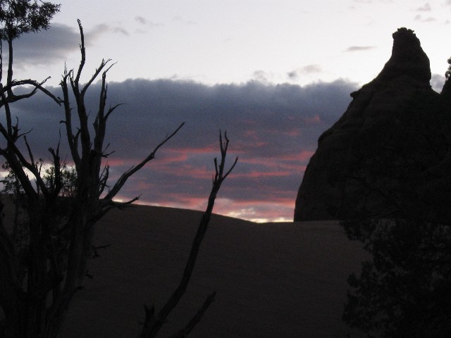 Sunset and most clouds to the N, S, and West depart. Not so those to the East. A walk of the small park produces petrified log chunks. There are nice warm showers, yet this SP is not as scenic as Kodachrome, my choice for a layover day.