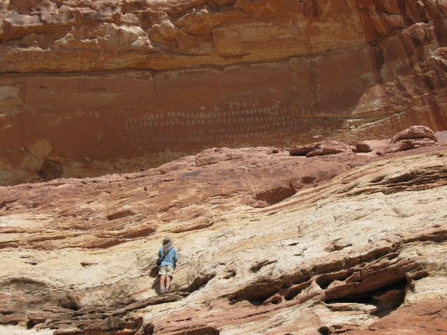 We started out from the SP and made it to Escalante before stopping for pancakes, a distance of 2 or so miles. Then on and up and then down into the crossing of the Escalante near where Calf Creek pours in. A hike up the native SS brings us to vandalized petros and the 100-hands picto panel. The road leads up, 14% grade in pitches and steep all the way beyond the Hogback. Then, finally down into Boulder town. Cheryl says it's a short ride that rides like a hundred miles.