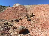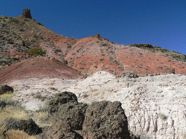 purplish clay hill with a sprinkling of white rocks forming its top. It is in the left