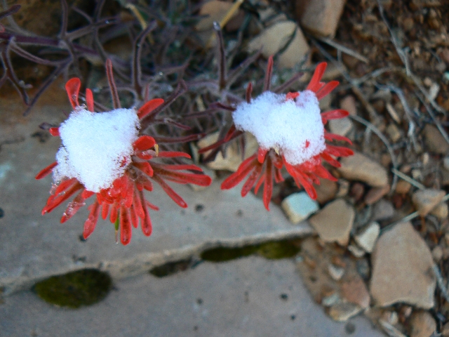 last night, coating the rocks and trees with a dappling of snow and ice. Lucky us.